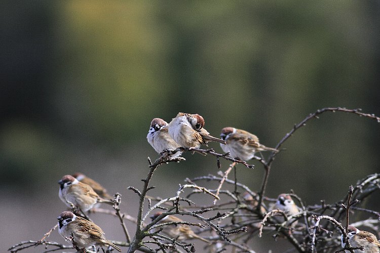 風が少し強かったが青空だし、河原に行くことに、途中、「スズメ」達が一休み。