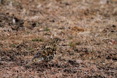 少し離れた場所に止めた車の中で待ってみた。じきに、先ほど飛び立った鳥が戻り、地面を踏み固めるようにしながらエサを探し始めた。トラツグミだ。